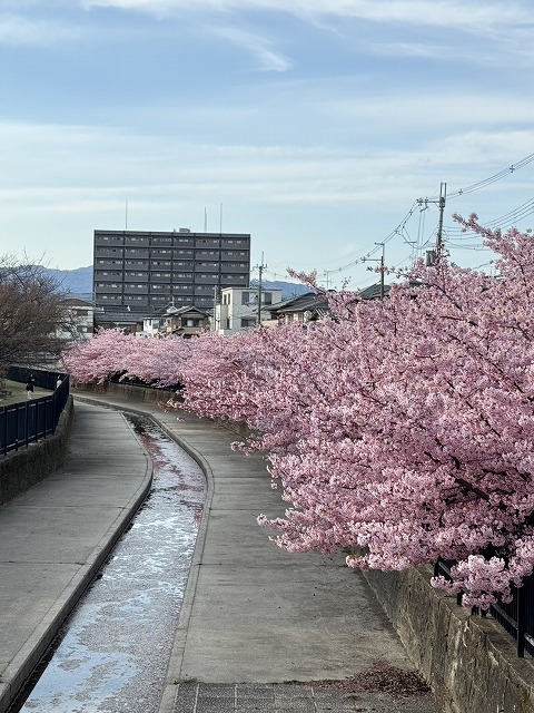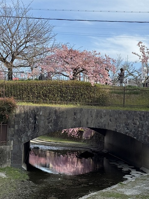水路に沿って河津桜が植えられており、歩道を歩きながらゆっくりお花見が楽しめます。