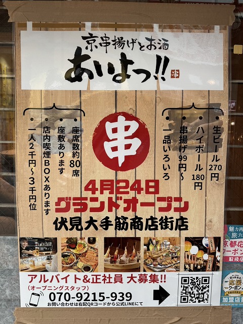伏見大手筋商店街は飲食店の入れ替わりもありつつ、常に新しい魅力が増えていくエリアですが、今回の「あいよっ!!」は、