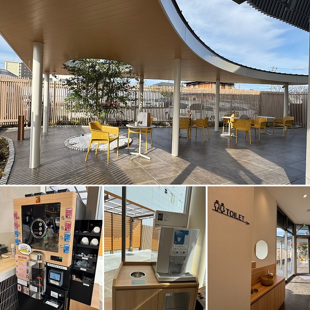 店舗の外にはテラス席もあり、購入したカステラやどら焼きをその場で楽しむことができます。お店の正面や一角にはベンチもありました。きれいなトイレもあります。
